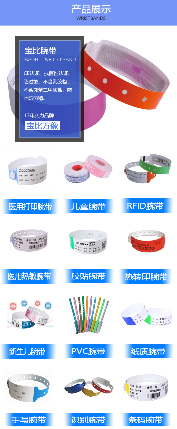 国内最早的医用腕带厂家之一,宝比万像专业生产医用腕带13年,客户遍布海内外,自有工厂,腕带品质高,品种丰富,性价比高。