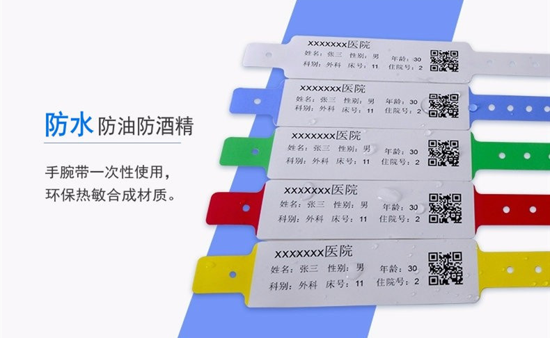 宝比万像生产各种类型的手腕带,医用腕带中就包含手写腕带、打印腕带,从材质上分又有纸质腕带、pvc腕带、塑料腕带、纳米硅腕带等,从应用技术上分也有识别腕带、条码腕带和rfid腕带。种类规格颜色齐全。