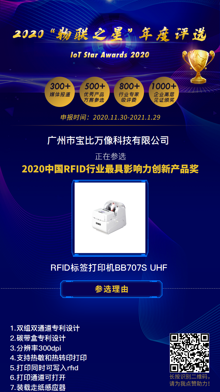 "2020物联之星"年度评选被誉为中国物联网的奥斯卡奖,每一年都有超过超过500+来自物联网感知层、通信层、平台层以及各类应用厂商企业参选。今年,宝比万像自主研发设计生产的RFID标签打印机BB707 UHF正在角逐RFID打印机专项奖,2021年1月29日前,每天可进入页面进行投票。